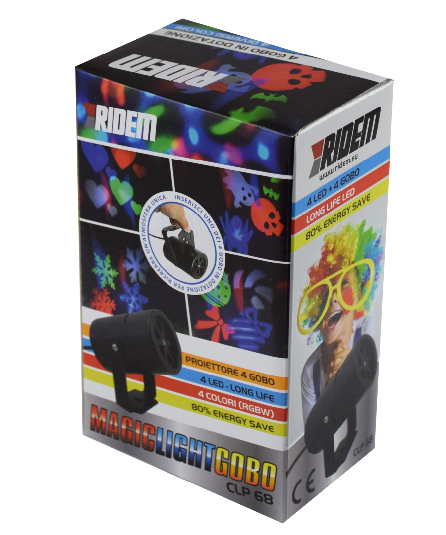 Compatto, semplice da utilizzare e immediatamente pronto all’uso. E’ sufficiente inserire la spina per proiettare, in continuo movimento, 4 soggetti. Colori e figure si incroceranno e varieranno in uno spettacolare effetto. Sfilando una scheda e inserendone un’altra l’atmosfera varierà radicalmente. 4 schede incluse per altrettanti temi (Halloween, Natale, S. Valentino, Inverno).