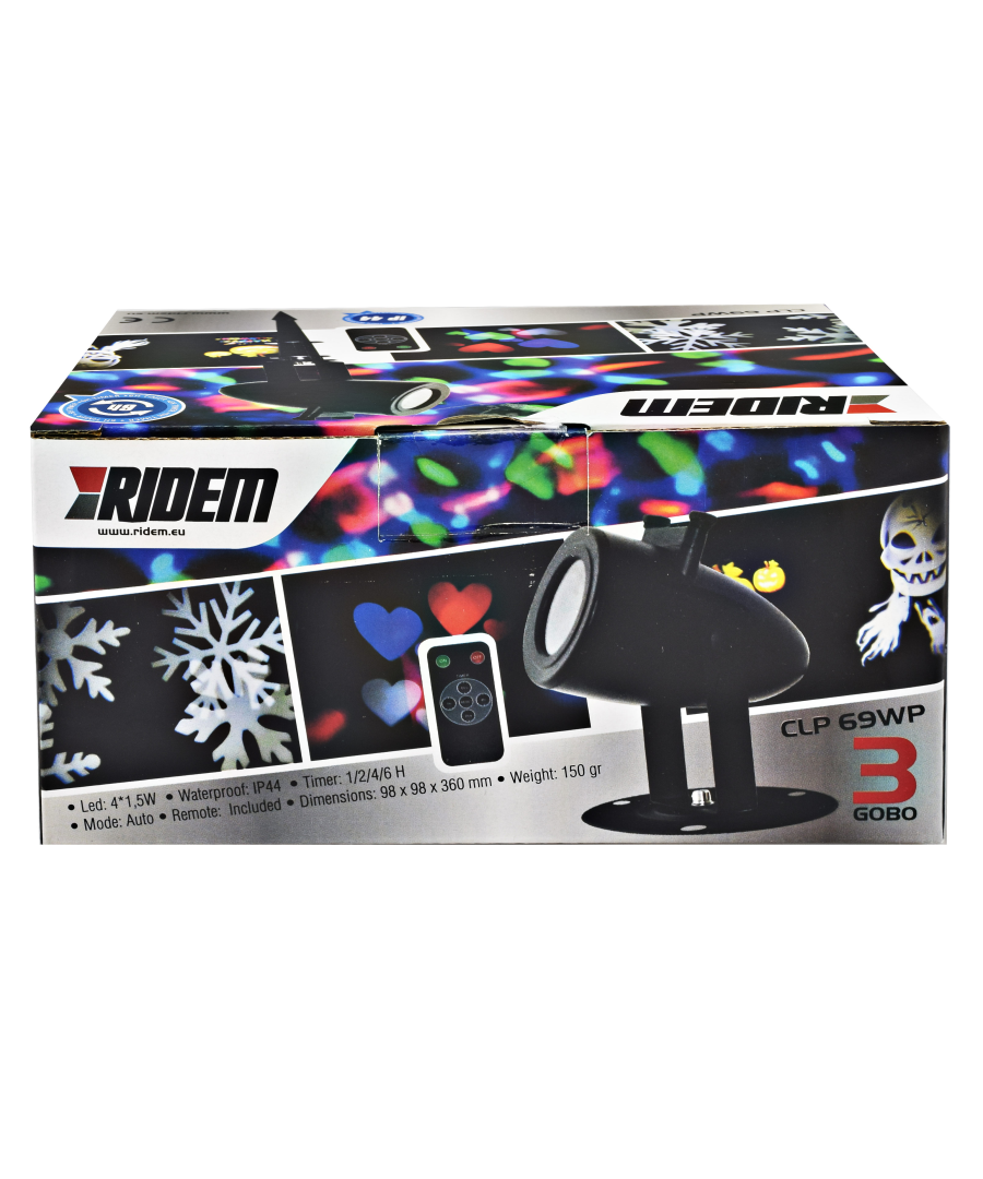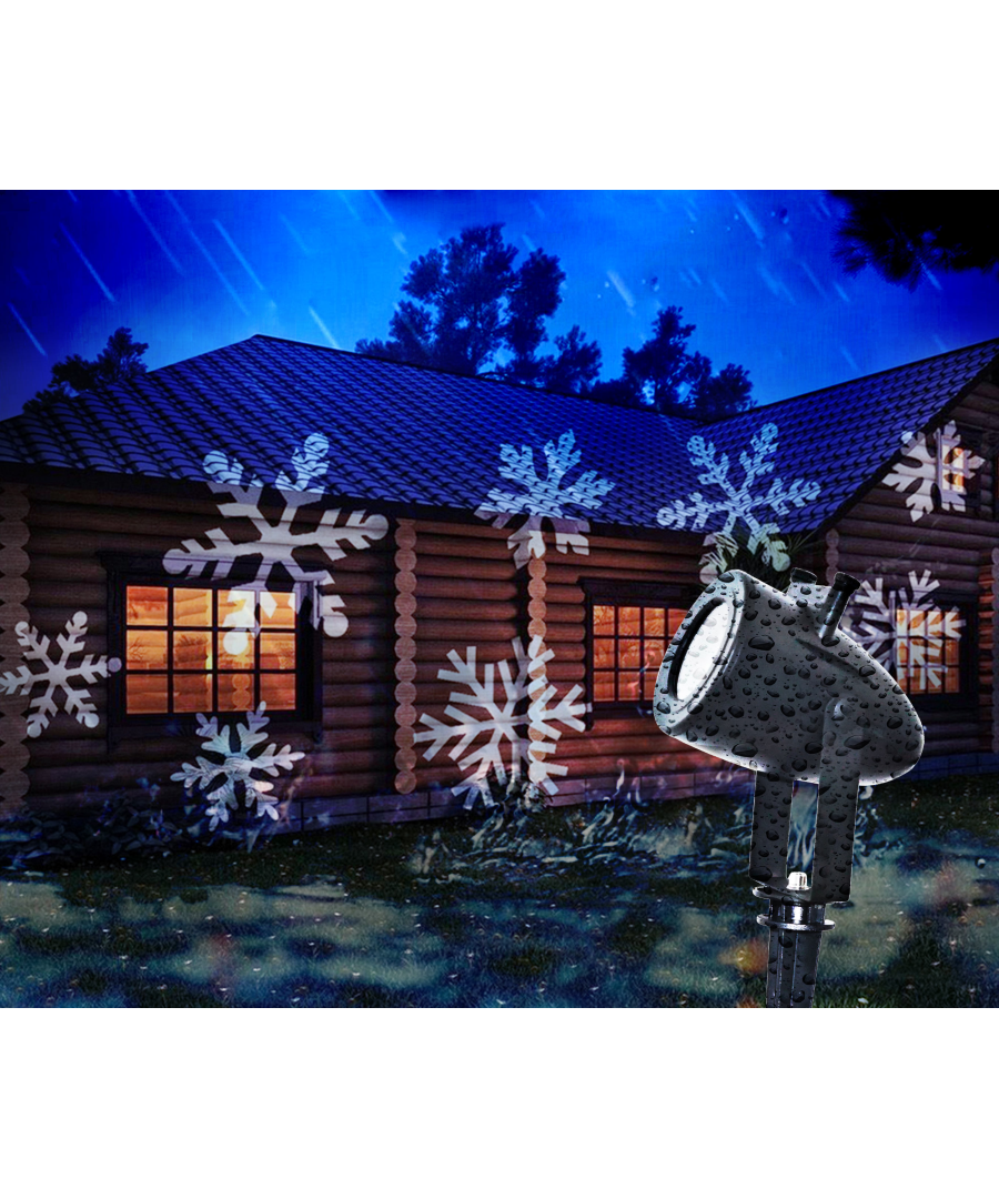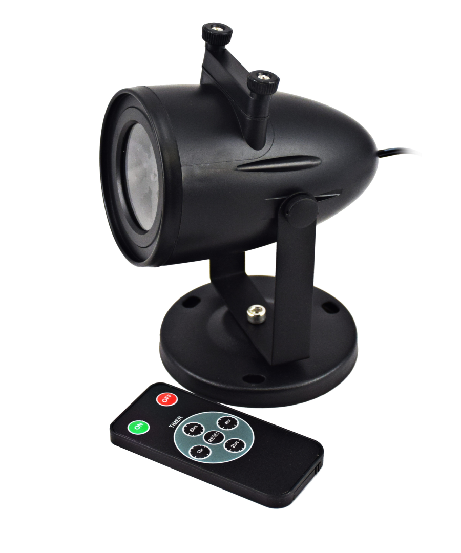 Proiettore a led ideato per utilizzo outdoor. E' possibile inserire una delle tre cartucce contenenti 3 diversi tipi di pellicole (halloween, fiocchi di neve e cuori di San Valentino). Il proiettore può essere fissato a tralicci tramite la staffa regolabile ma anche posizionato in giardini grazie al picchetto incluso nella confezione. Un pratico telecomando permette di attivarlo a distanza programmandone l'accensione per un tempo di 2, 4 o 6 ore. Il cavo è da 1mt.
