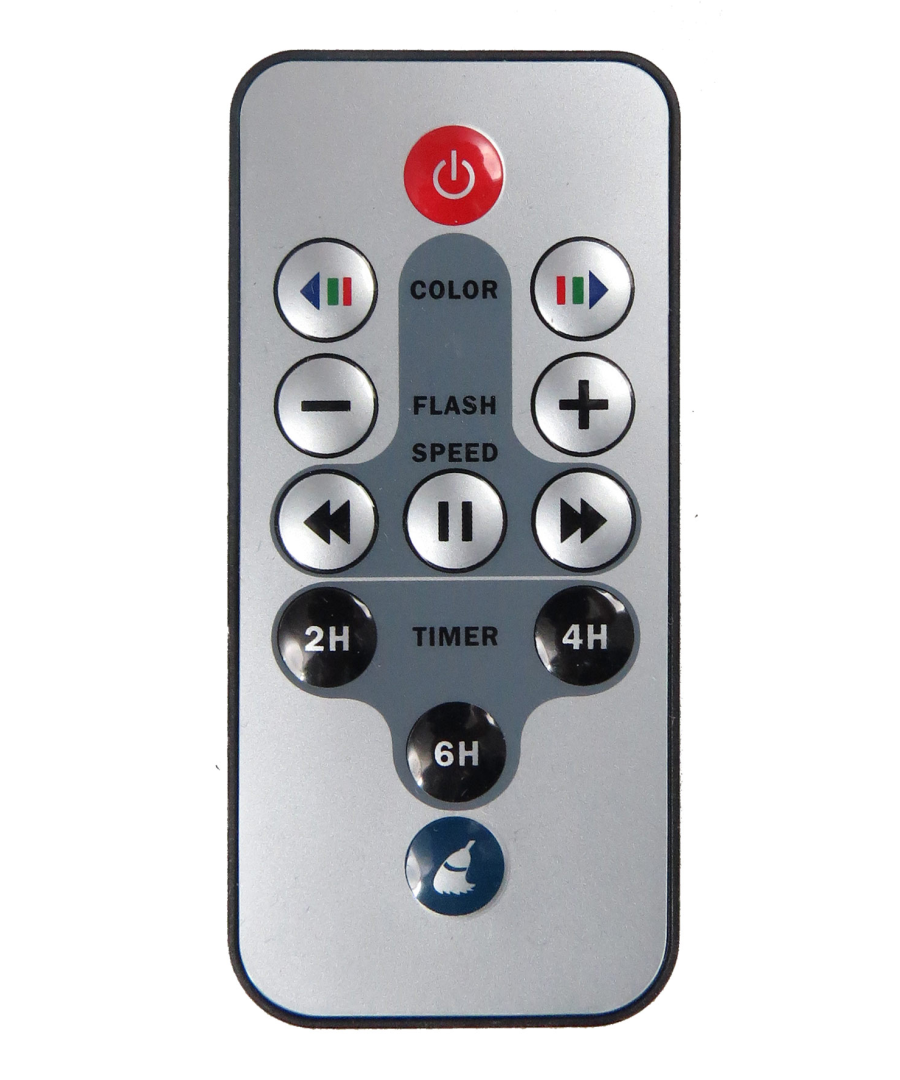 In dotazione troverete il pratico telecomando con temporizzatore che permette, di scegliere il colore del laser, di selezionare la velocità di movimento e la frequenza di lampeggio, oltre che di settare il tempo per il quale l'apparecchio dovrà operare prima di spegnersi, evitando inutili consumi e prolungando notevolmente la vita dei laser. Il timer è settabile su 2, 4, 6 ore di funzionamento.