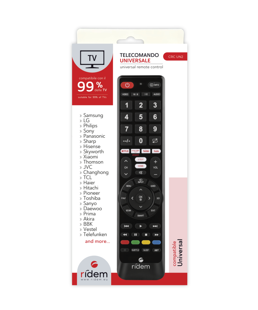 Ideato per controllare il 99% delle TV in commercio. 25 brand sono pre-memorizzati e selezionati con la semplice pressione di un tasto (LG, PHILIPS; SONY, HISENSE, SAMSUNG, TCL, TELEFUNKEN, PANASONIC ...) Per gli altri marchi di TV è possibile utilizzare una ricerca automatica, manuale o provare ad inserire dei codici specifici.